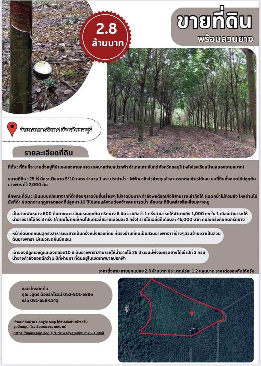 ขายด่วน ด่วน ด่วน ขายที่สวนยางพารา 25 ไร่ มีต้นยาง 2,000 ต้น อายุ 11 ปี ขณะนี้ทำรายได้ 45,000 .-ต่อเดือน มีรายได้ยาว 26 ปี ที่ดินตั้งอยู่บ้านหนองยายหมาด อำเภอเกาะจันทร์ จังหวัดชลบุรี ขายยกแปลง 2.8 ล้าน สนใจติดต่อคุณวิสูตร 0638016886 เจ้าของขายเอง ต้องการขายด่วน