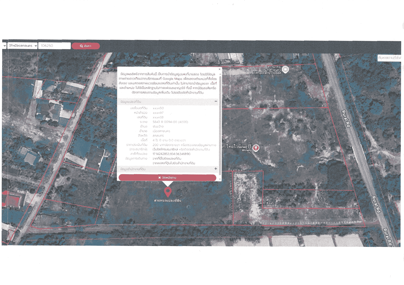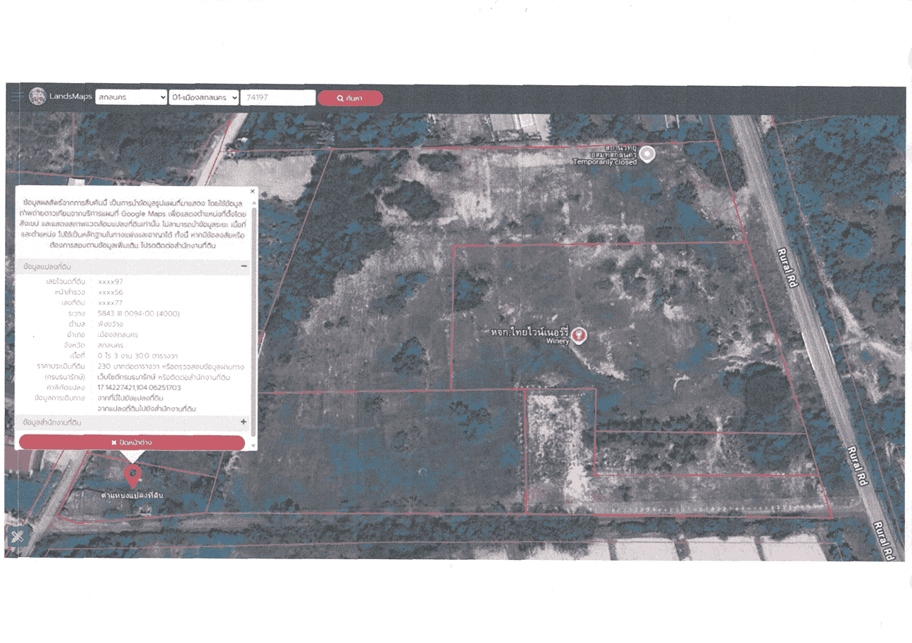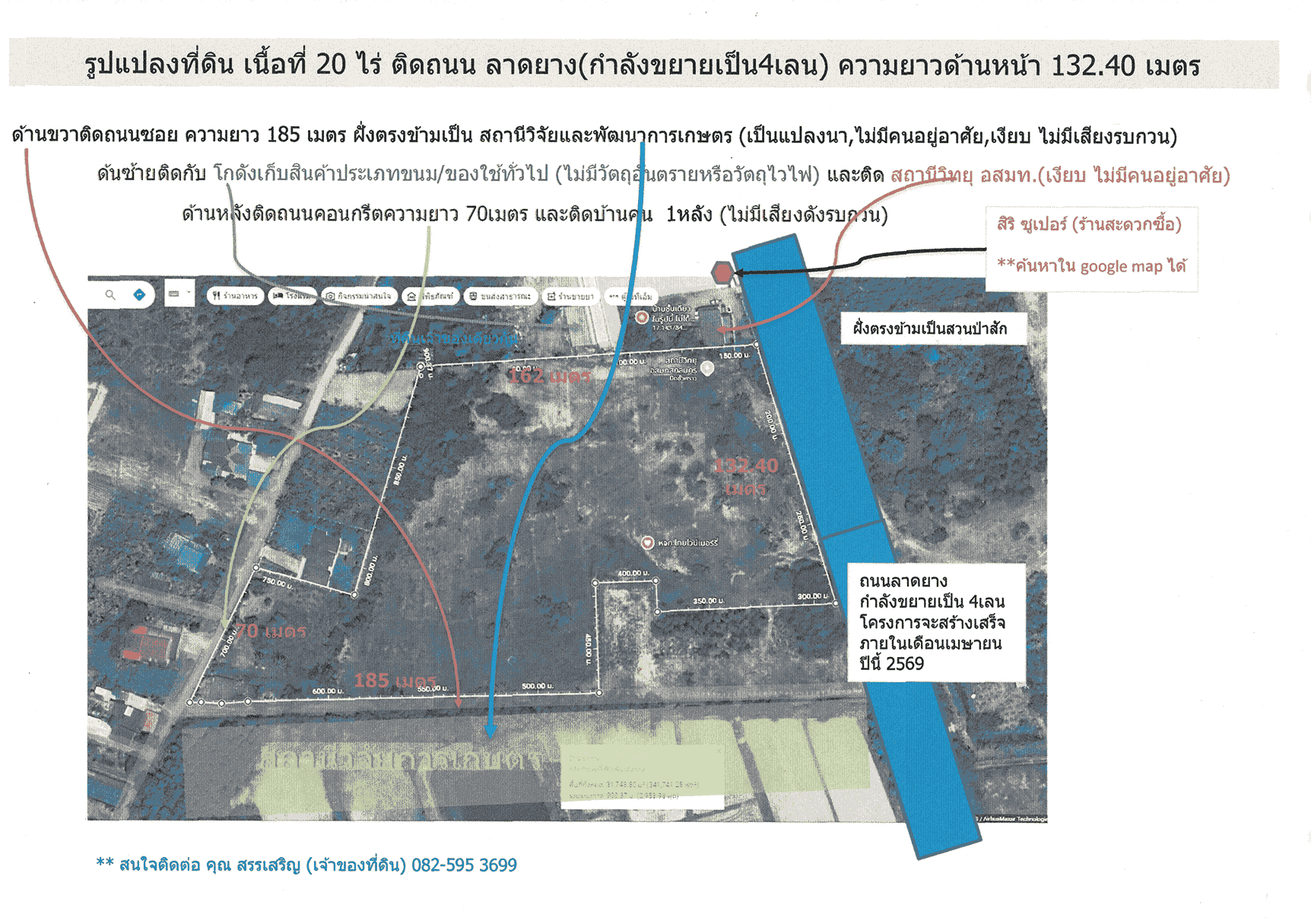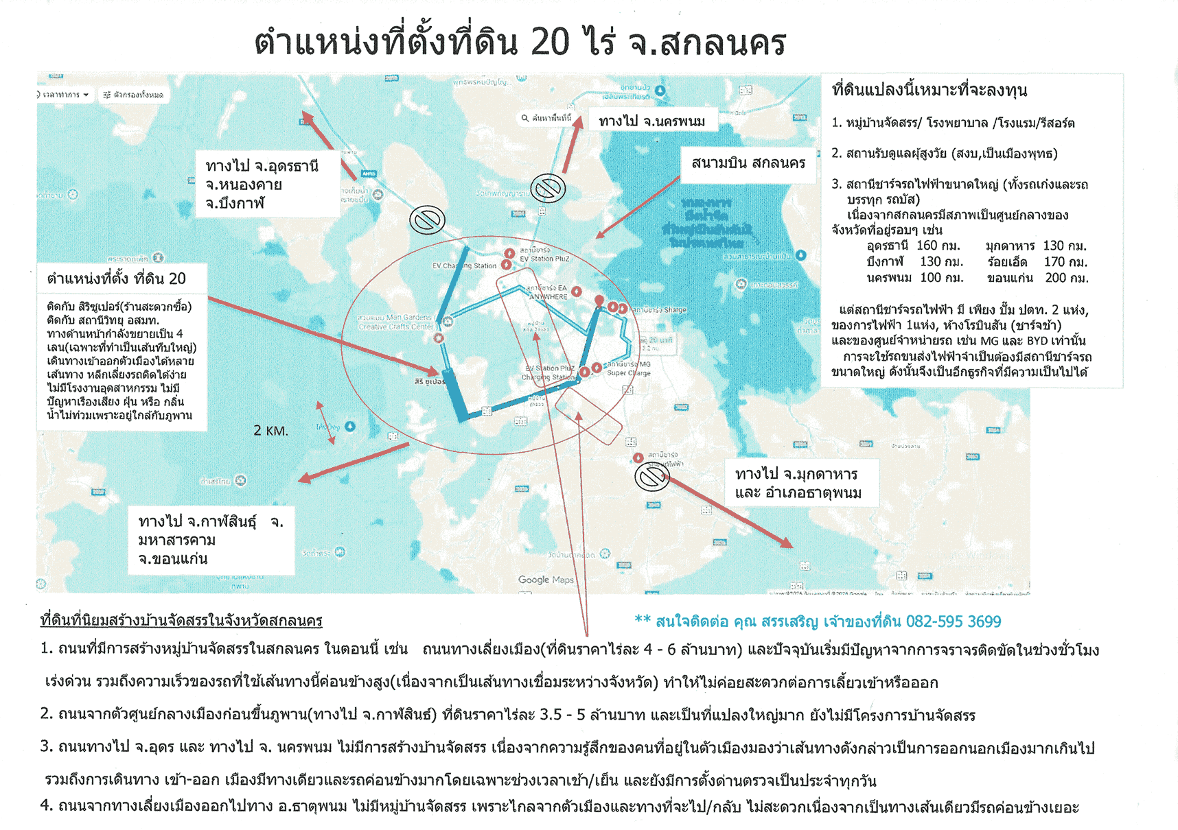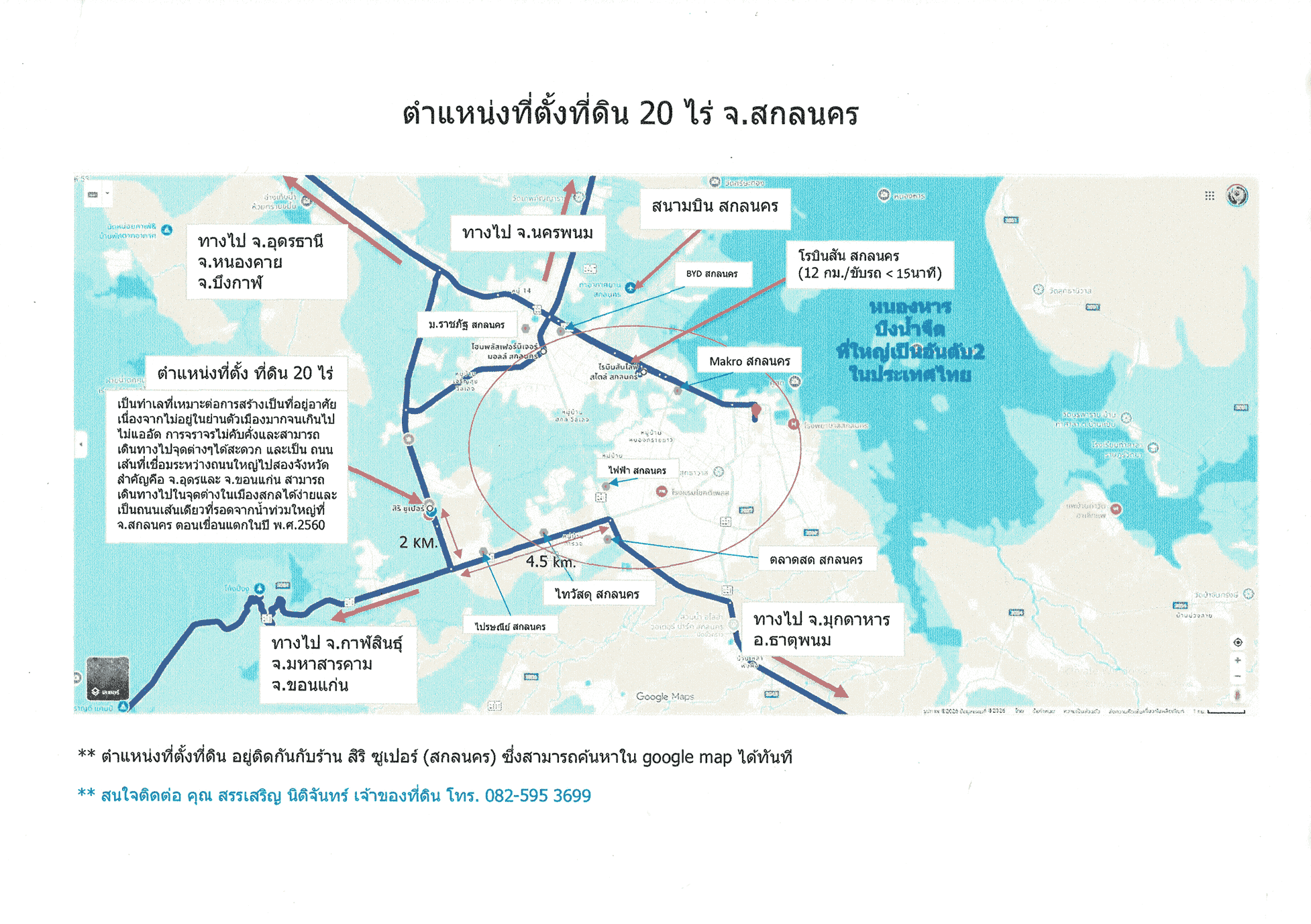 ขายที่ดิน 20ไร่ ด้านหน้าติดถนน 4เลน(กำลังสร้าง)ยาว 132.4 เมตร ด้านข้าง(ขวา)ติดถนนซอยยาว 185เมตร ด้านหลังติดถนนซอย(คอนกรีต)ยาว 70เมตร(ดูภาพประกอบ) ทำเลดีมาก เดินทางเข้าใจกลางเมืองได้หลายวิธี(ที่ดินตั้งอยู่บนถนนที่เชื่อมระหว่าง ทางหลวงระหว่างจังหวัด สกล-กาฬสินธิ์และขอนแก่น และ ทางหลวงระหว่างจังหวัด สกล-อุดรธานีและบึงกาฬ) ขับรถถึงโรบินสันสกลนครได้ภายใน10นาที และจุดอื่นๆในตัวเมืองได้อย่างสะดวกมาก ถนนด้านหน้า รถไม่มาก รถไม่ติดในช่วงเร่งด่วน การจราจรไม่เร็วเหมือนทางหลัก ที่ดินแทบจะไม่ติดกับบ้านคนเลย(ติด1หลังทางด้านหลังเท่านั้น/ดูคำอธิบายประกอบรูปภาพ) เหมาะกับการลงทุน 1.ทำบ้านจัดสรร 2.ทำโรงพยาบาล 3.ทำโรงแรม/รีสอร์ตขนาดใหญ่ 4.ทำสถานีชาร์จรถไฟฟ้าขนาดใหญ่ 5. สถานรับดูแลคนสูงวัย และอื่นๆ ในที่ดินมีบ่อน้ำบาดาลที่เจาะไว้แล้ว มีน้ำที่จืดและมีปริมาณมาก (ที่ดินอยู่ห่างจากตัวเทือกเขาภูพานเพียง2กม.เศษ) น้ำไม่ท่วมเด็ดขาด(วัดจากตอนเขื่อนแตกในปี2560) ไม่อยู่ใกล้โรงงานหรืออื่นๆที่มีเสียงดัง
