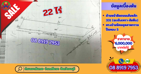 ขายที่ดิน จำนวน 22 ไร่ ติดถนน 331 (สัตหีบ-ฉะเชิงเทรา) ตรงข้ามนิคมอุตสาหกรรมปิ่นทอง 5 เขาคันทรง ขายไร่ละ 6 ล้านบาท