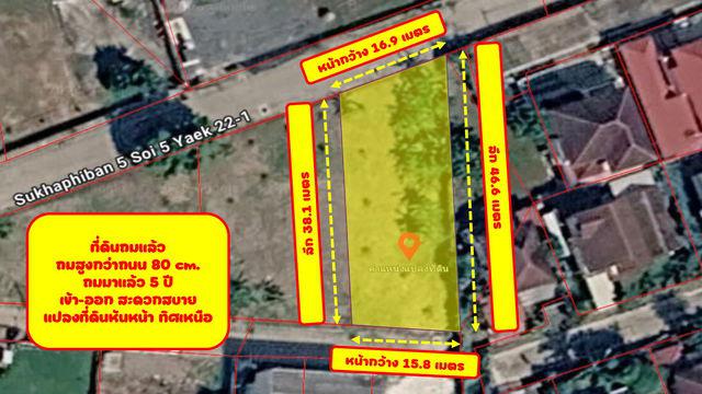 หน้ากว้าง 16.9 เมตร ลึก 46 เมตร (ถมสูงกว่าถนน 80 cm. ผ่านมา5ปี ดินแน่นพร้อมใช้งาน)