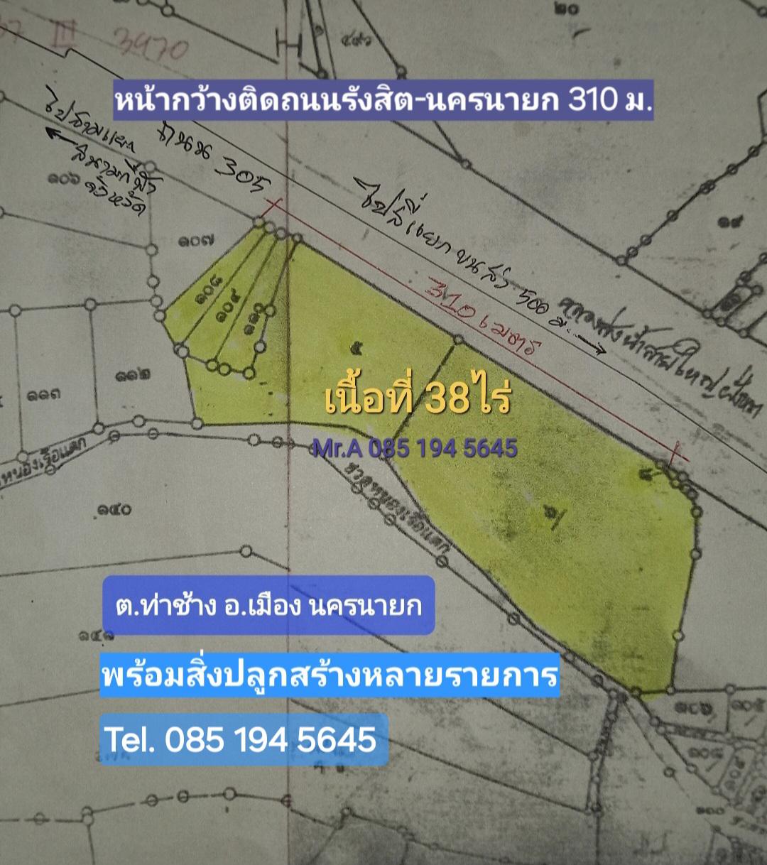 ขอเสนอที่ดินแปลงสวย หน้าติดถนน รังสิต-นครนายก พร้อมสิ่งปลูกสร้างทั้งหมด ที่ตั้ง ต. ท่าช้าง อ. เมือง นครนายก เนื้อที่ 38ไร่ เอกสารโฉนด ราคาพิเศษ ไร่ละ 2,500,000บ. ค่าโอนคนละครึ่ง สนใจโทร 085 194 5645 เอ