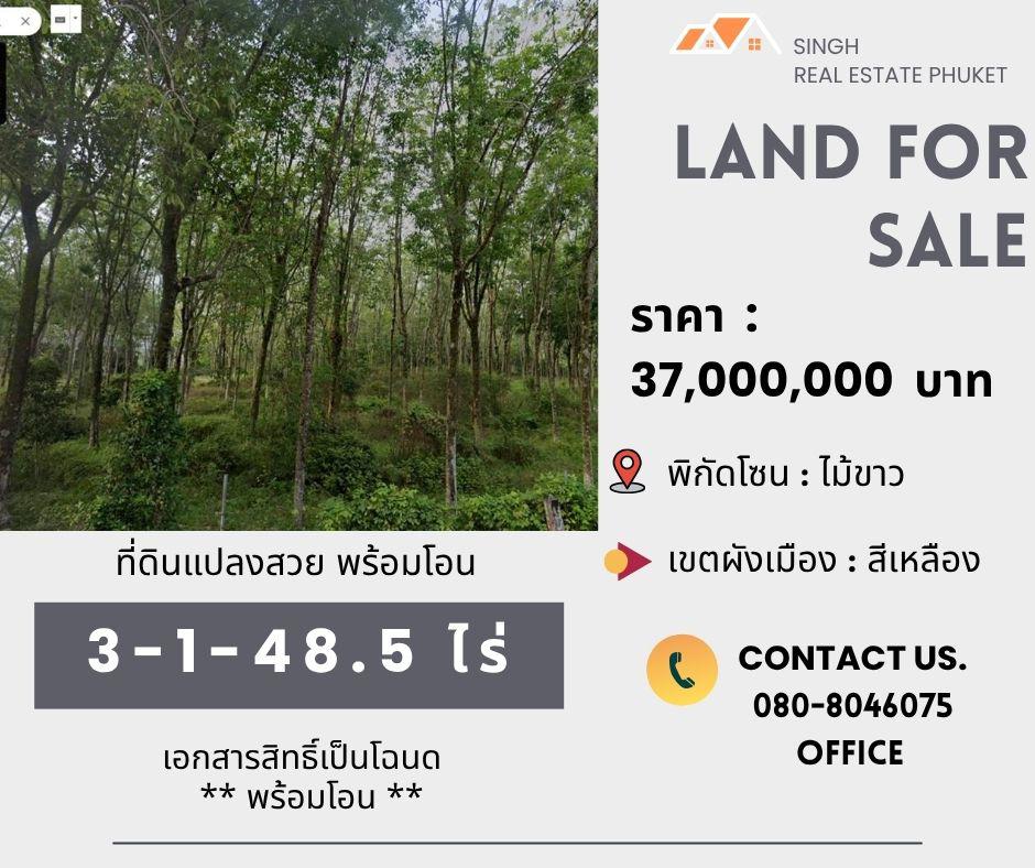 ** LAND FOR SALE ** ที่ดิน ( สวนยางพารา ) 3-1-48.5 ไร่ ( บ้านบ่อส้อม - ไม้ขาว )