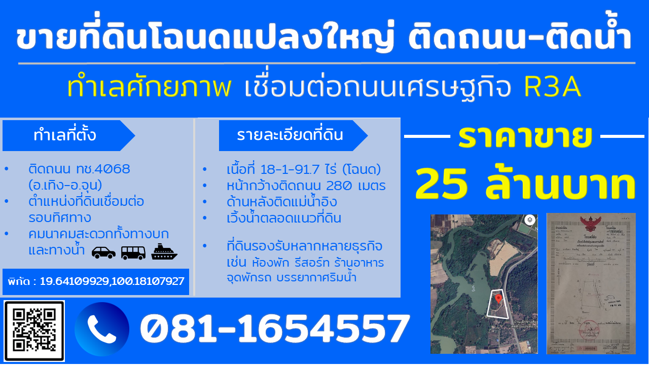 ขายที่ดินศักยภาพสูง] 20 ไร่ ติดแม่น้ำอิง + หน้ากว้างติดถนน 280 เมตร บนเส้นทางยุทธศาสตร์ R3A (เชียงราย)