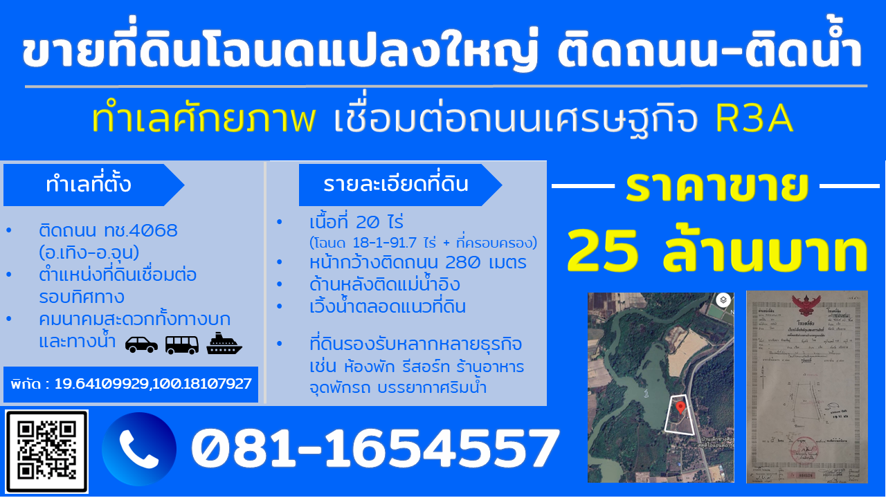ที่ดินเชียงราย ที่ดินสวย ติดถนนหลัก หน้ากว้าง ด้านหลังติดแม่น้ำ วิวเวิ้งน้ำส่วนตัวตลอดแนวที่ดิน 25ลบ.(20ไร่)