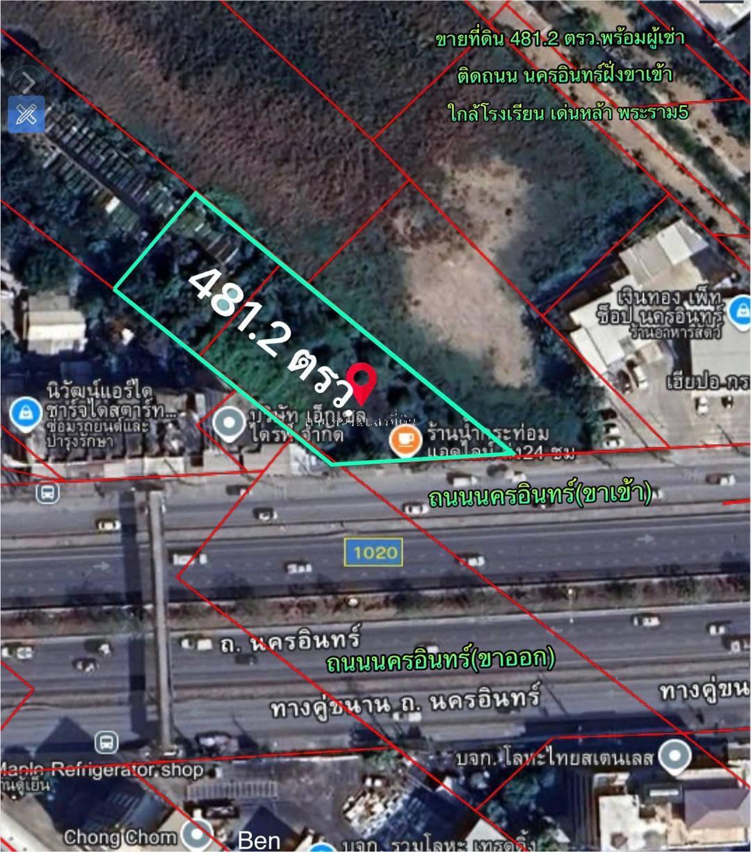 R69-065ขายที่ดิน 481.2 ตรว.ติดถนนนครอินทร์ฝั่งขาเข้าพร้อมผู้เช่า มีรายได้ทันที ห่างจากโรงเรียนเด่นหล้าเพียง200เมตร หน้ากว้างติดถนนนครอินทร์ 36 เมตร