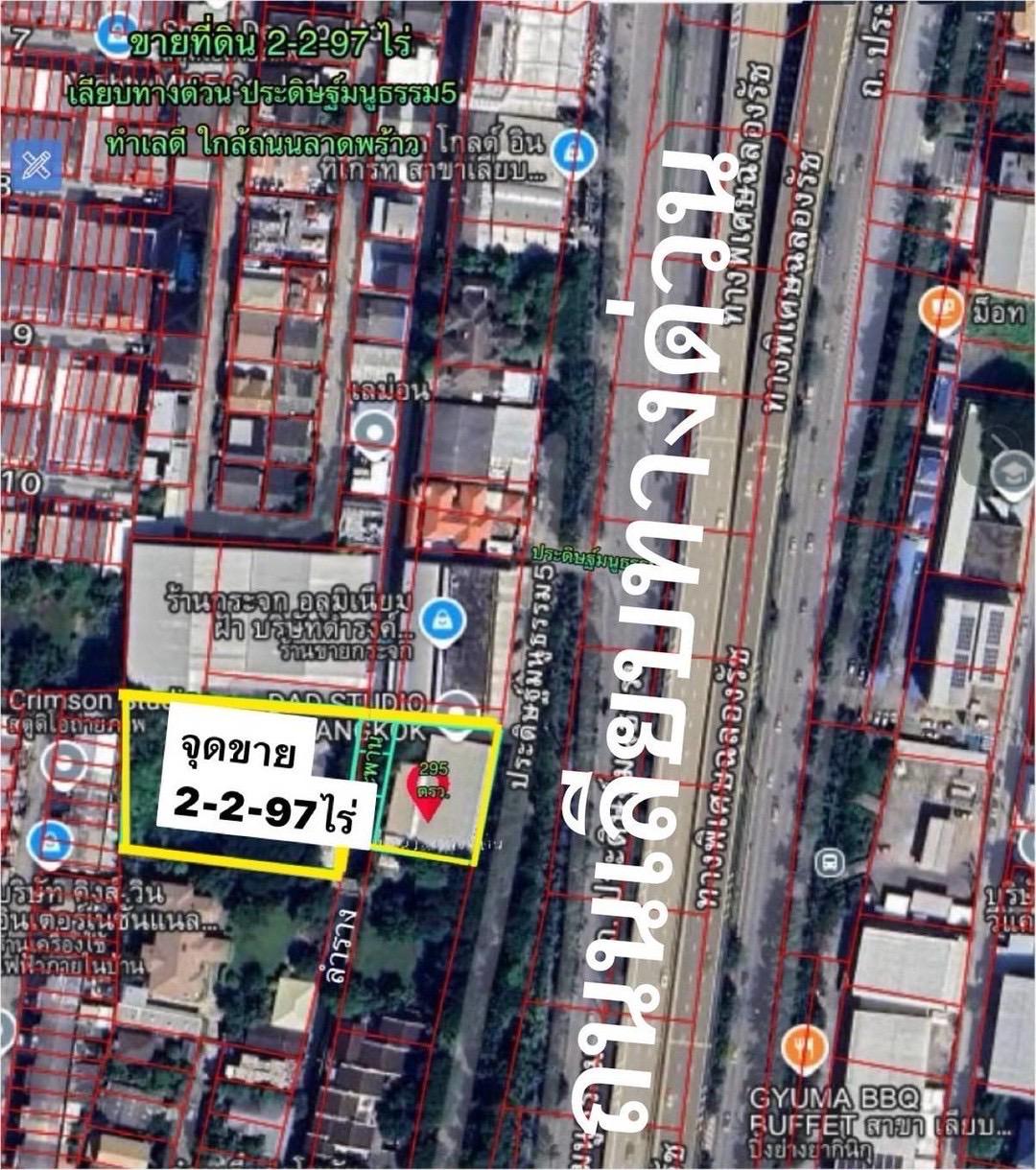 R68-060ขายที่ดินเลียบทางด่วนเอกมัยรามอินทรา ที่ดิน 2-2-97 ไร่ (ซอย.ประดิษฐ์มนูธรรม 5 )ที่ดินอยู่ในแหล่งของห้างสรรพสินค้ามากมายทั้งในถนนเลียบทางด่วนและถนนลาดพร้าวทั้งยังอยู่ใกล้สถานีรถไฟฟ้าปากซอยลาดพร้าว71 และยังอยู่ไม่ห่างจากจุดขึ้นลงทางด่วนเอกมัย รามอินทรา ทาวน์อินทาวน์ และโรงพยาบาลหลายแห่ง ที่ดินเหมาะทำออฟฟิตสำนักงาน คอนโด หรือซื้อเพื่อปล่อยให้เช่า