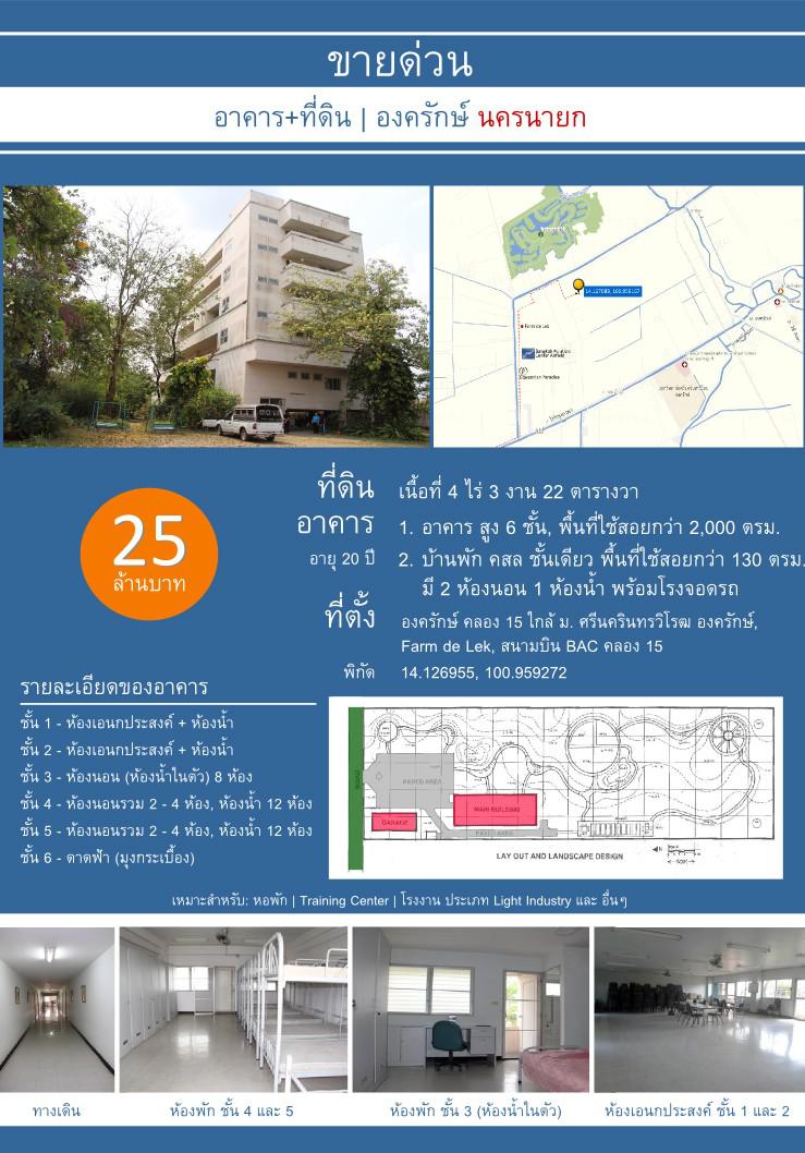 ที่ดินเนื้อที่ 4 ไร่ 3 งาน 22 ตารางวา/ อาคาร อายุ 25 ปี 1.อาคารสูง 6 ชั้น พื้นที่ใช้สอยกว่า 2,000 ตรม.