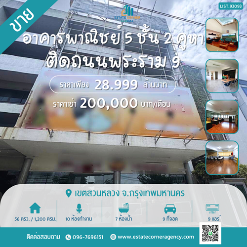 ขาย / เช่า อาคารพาณิชย์ 5 ชั้น 2 คูหา ราคามิตรภาพ ติดถนนพระราม 9 เขตสวนหลวง ด้านหลังติดถนน ซอยหมู่บ้านเสรี7 แยก 6
